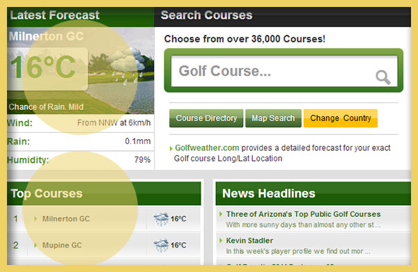 Golfweather.com is a weather forecast system that provides a unique weather feed for the exact longitude and Latitude location of each golf course. We do NOT forecast weather from the nearest town or airport but directly for the golf course itself.